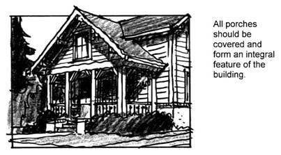 Porches. Porches should be an integral architectural feature with the main structure. All porches will incorporate railings when required by UBC. Porches may extend up to five feet into the front setback. Porches may be raised or at ground level.
