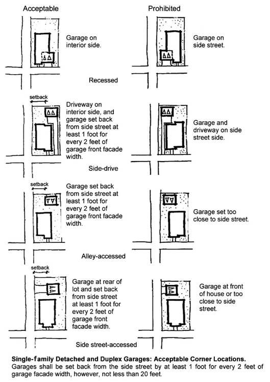For rowhouses, townhouses, paseo homes, and green court dwelling units, the garage must be accessed from an alley or lane.