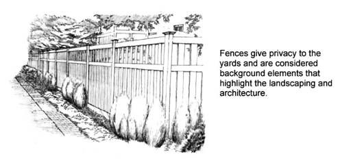 Fencing. Fences help define the edges of yards and provide privacy. They are considered background elements that help highlight landscaping and architecture. Front yard fences are allowed up to thirty-six inches in height. All interior side yard privacy fences must be set back a minimum of four feet from the front facade of the building. The following regulations apply to fencing: