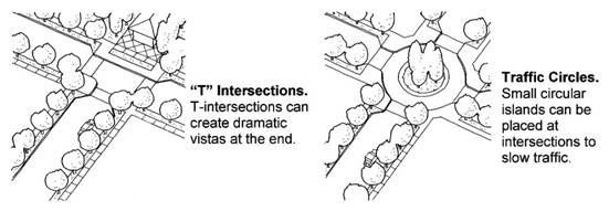 "T" Intersections. Road alignments are generally offset at least one hundred fifty feet, forcing turning movements. If carefully sited, "T" intersections can also create prominent vistas to parks and civic features.