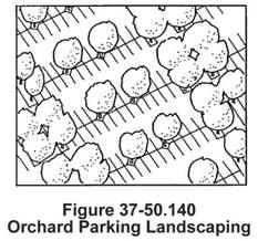 A minimum of one tree for every five parking spaces shall be provided in landscape islands (see Figure 37-50.140). The islands shall have a minimum dimension of five feet exclusive of curbs.