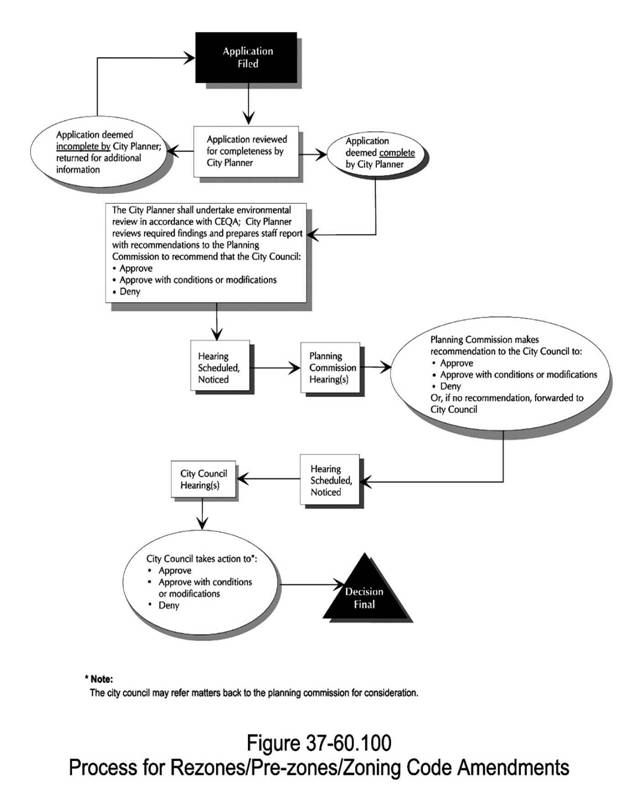 The purpose of this division is to provide a process to change the boundaries of zoning districts on the zoning map (including the pre-zoning of areas that will be annexed to the city) and to change regulations of this Zoning Code. Figure 37-60.100 illustrates the rezone, pre-zone, and Zoning Code amendment process.
