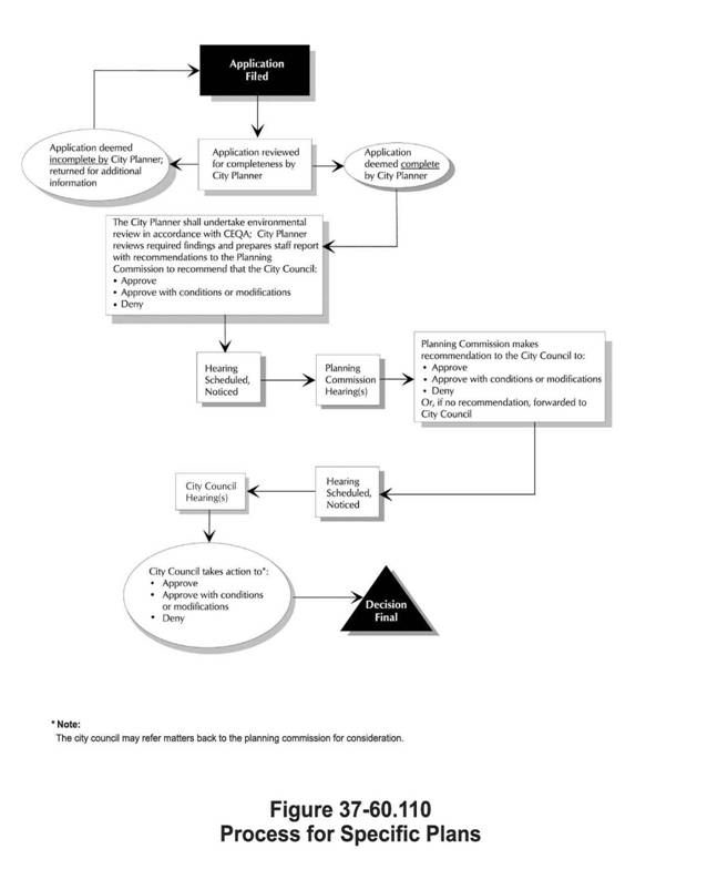 The purpose of this division is to provide a process for the development, adoption, and amendment of specific plans and to ensure that the Zoning Code is consistent with state law regulating specific plans, and in particular, Article 8 of Chapter 3 of the California Government Code, commencing with Section 65450 as may be subsequently amended by the state of California. Figure 37-60.110 illustrates the specific plan process.