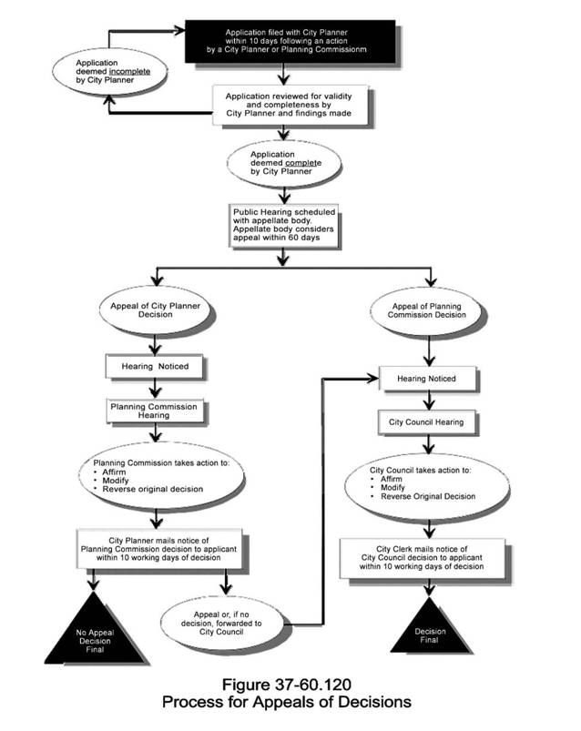 To avoid results inconsistent with the purposes of this Zoning Code, decisions of the city planner may be appealed to the planning commission, and decisions of the planning commission may be appealed to the city council. Figure 37-60.120 illustrates the appeals process.