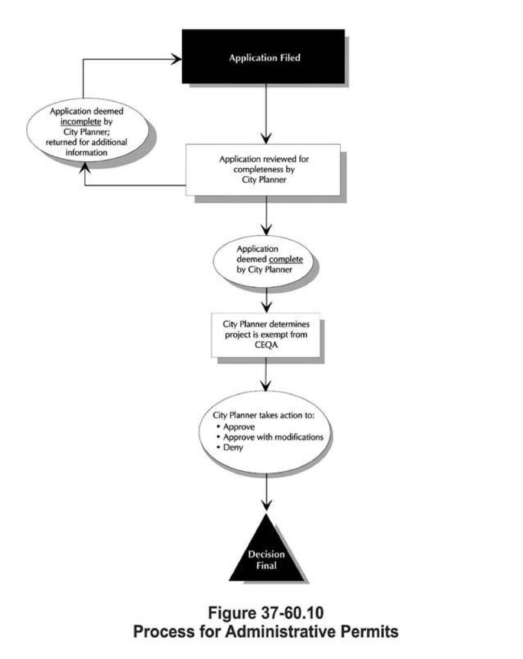 Are not subject to discretionary or review requirements of this article, including home occupation permits, temporary use of land permits, large family day care home permits, master sign plans, sign permits, medium project employee housing, and Type A emergency shelters. Site plan review applications, although administrative in nature, shall be subject to the requirements of Division 5: Site Plan Review. Figure 37-60.10 illustrates the administrative permit process.