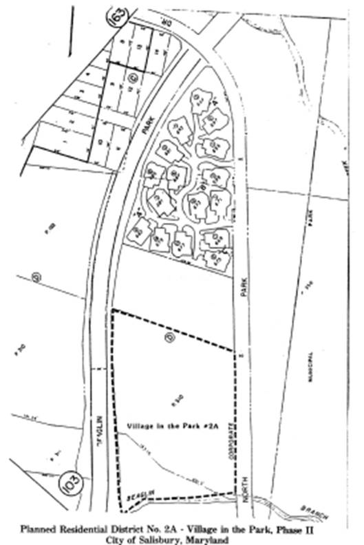 The area to be rezoned as planned residential district No. 2A—Village in the Park, Phase II, consists of five and one-hundredths (5.01) acres of land situated in the Parsons Election District, in the City of Salisbury, on the westerly side of and binding upon Beaglin Park Drive and on the easterly side of and binding upon North Park Drive; adjoining the land now or formerly owned by Keith E. Rinehart on the south, and the Beaglin Branch on the north. The site is shown on Assessment Map No. 38 as Parcel 310 and is more specifically defined on the preliminary subdivision plat prepared by Hampshire, Hampshire and Andrews, dated March 31, 1988, and approved by the planning commission on May 19, 1988.