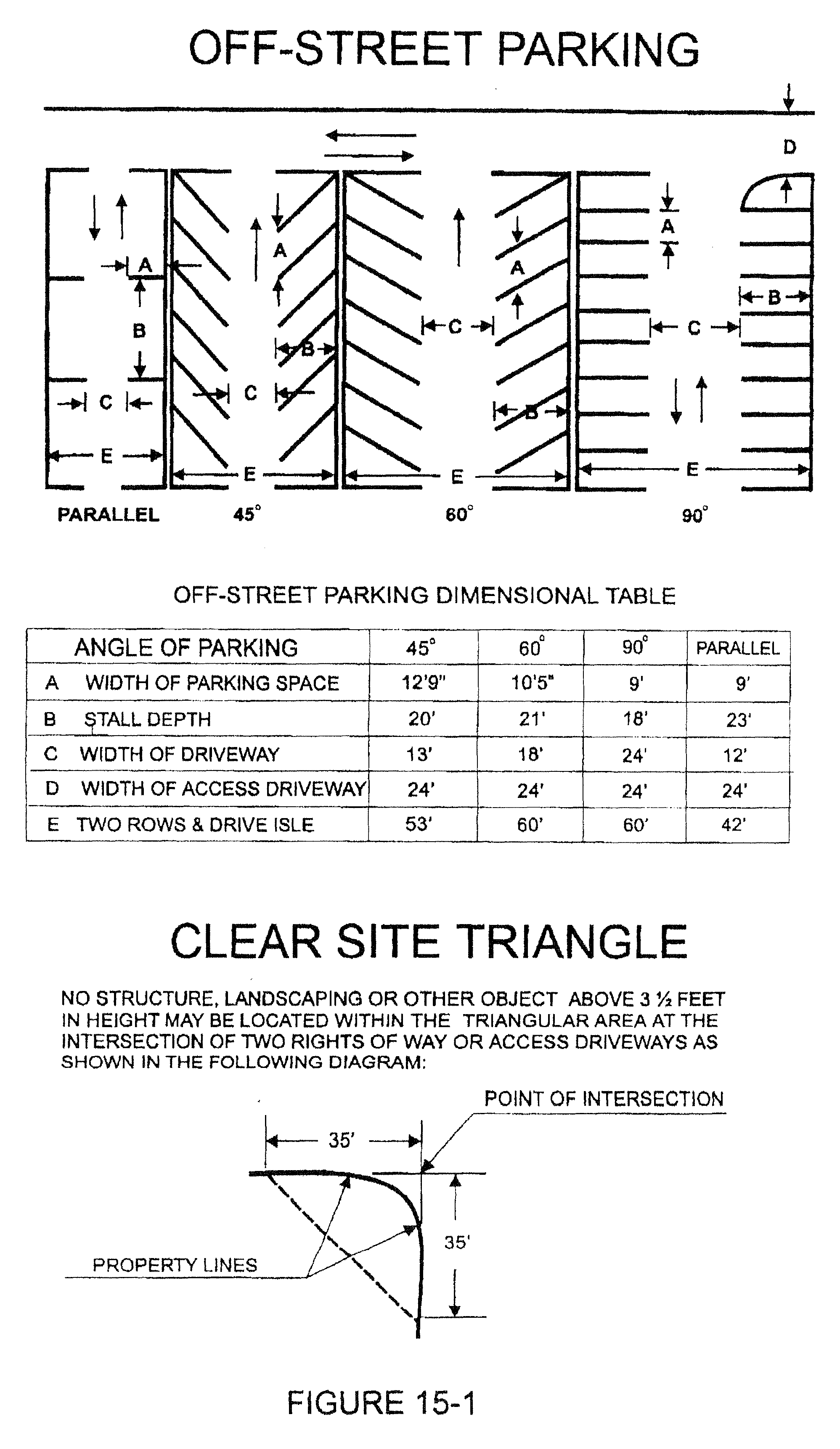 Off-street parking dimensions. Required off-street parking areas for three or more vehicles shall be designed, maintained, and regulated so that no parking or maneuvering incidental to parking shall be on a public street or walk, and so that a vehicle may be parked and unparked without moving another vehicle. The minimum dimensions for required off-street parking spaces shall be as provided in Figure 15-1.