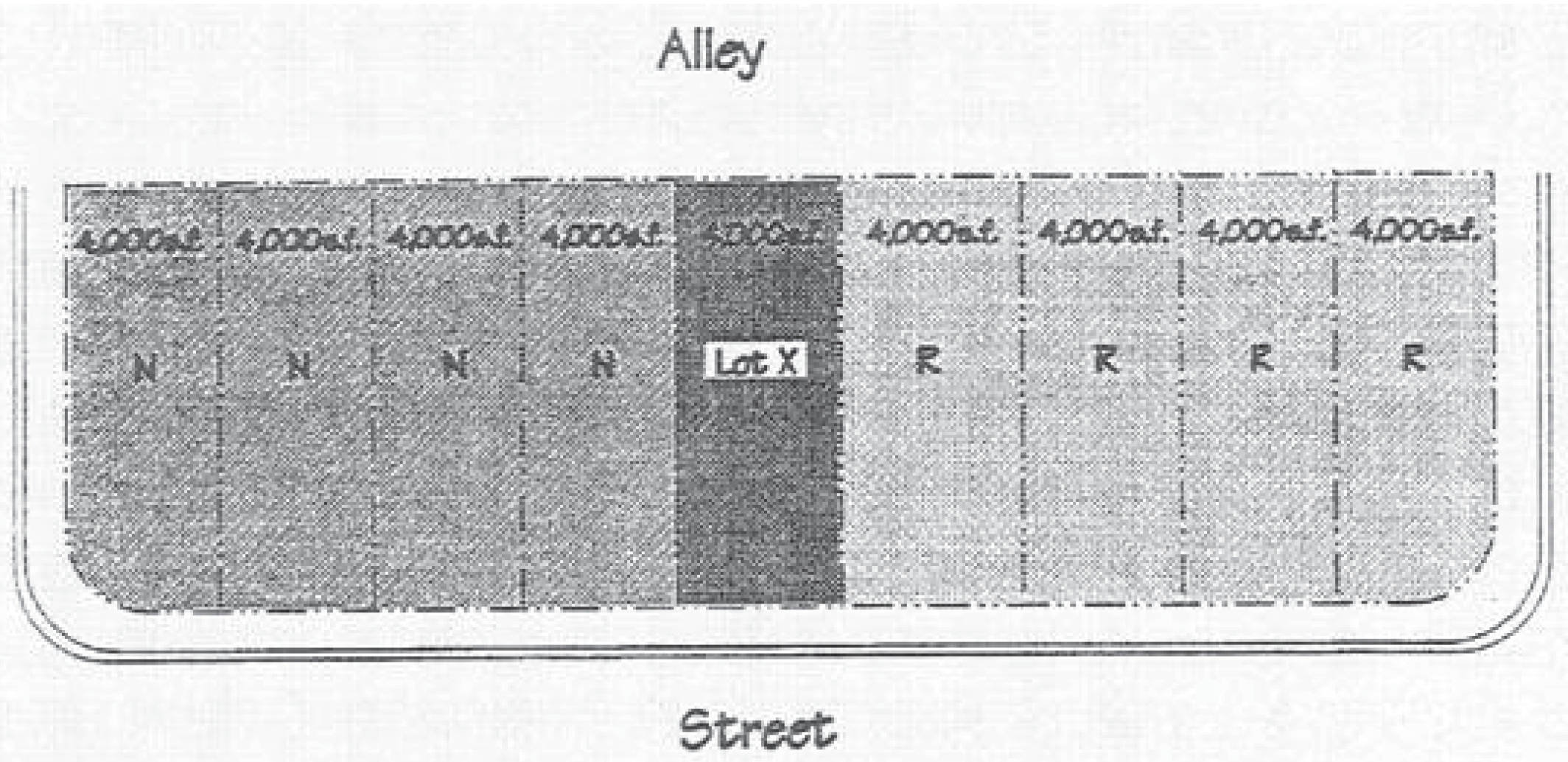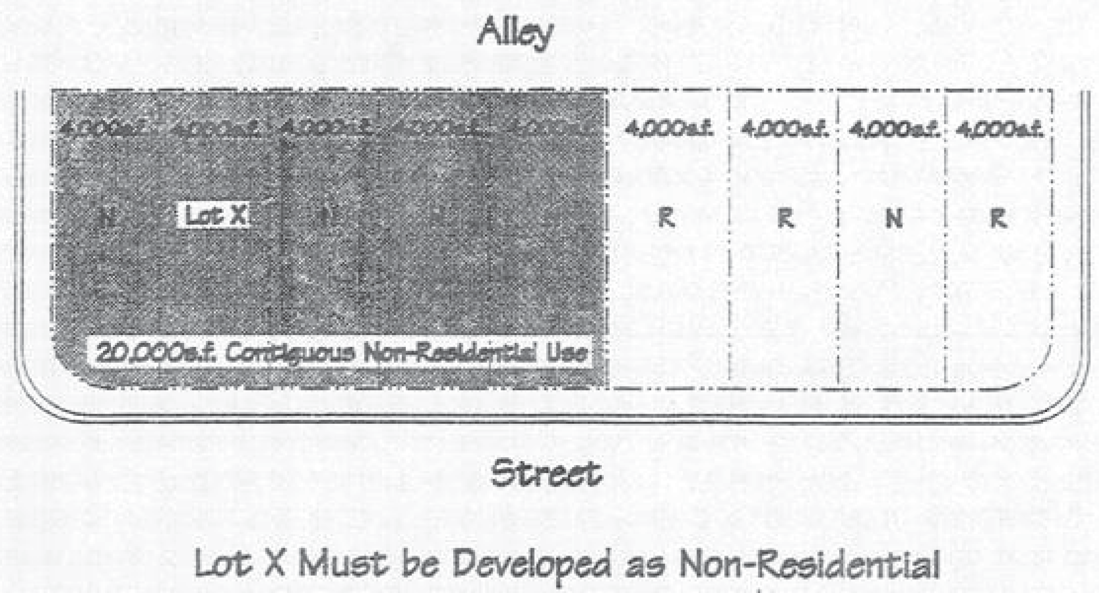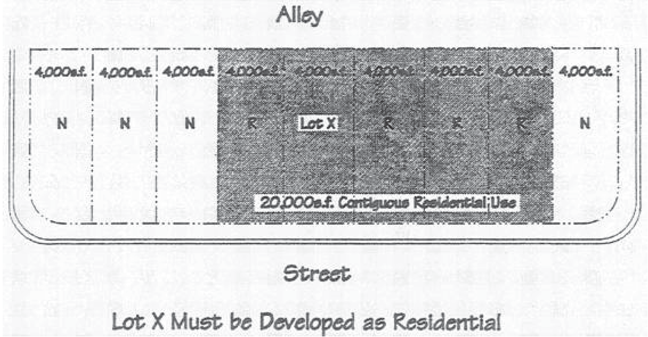 Contiguous lot area, for the purpose of this standard, includes the lot area of contiguous adjacent parcels which are currently developed with the use in question (residential or nonresidential). Contiguous lot area is calculated within blocks. Parcels located on adjacent blocks are not counted in contiguous lot area calculations.