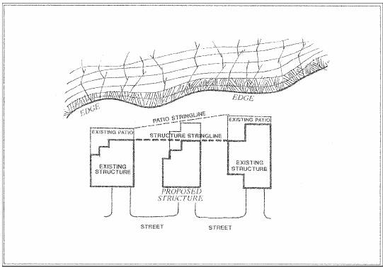 In accordance with a stringline drawn between the nearest corners of adjacent structures on either side of the development (see Subsection (D)(4), Infill Development).