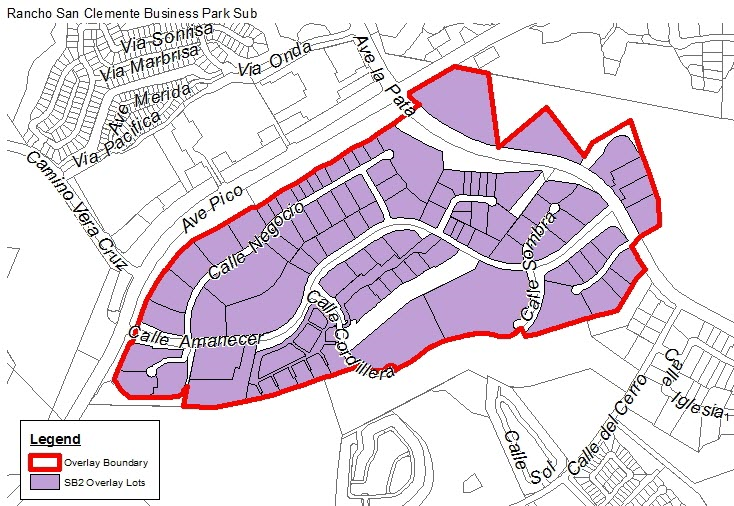 SB 2 Emergency Shelter Overlay District Established. .....The City hereby establishes an "SB 2 Overlay Zone" or District. In this District, emergency shelters which meet the following standards shall be allowed by right. The SB 2 Overlay shall consist of the Rancho San Clemente Business Park Sub-Area. This sub-area is shown in Figure A below.