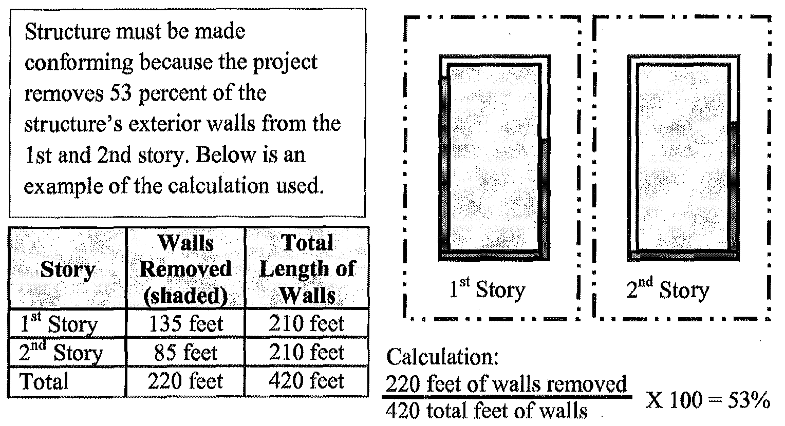Calculation. Exterior wall improvements are regulated based on the percentage of exterior walls that are removed or altered. The percentage of improvements is calculated by dividing the total length of exterior walls that are removed or altered by the total length of a structure's exterior walls. This fraction is multiplied by 100. For example, when wood framing is removed from the exterior wall of a wood framed building, then that wall would be counted along the entire length of the area where the wood framing is removed. See Figure 17.72.050 A. for explanation.