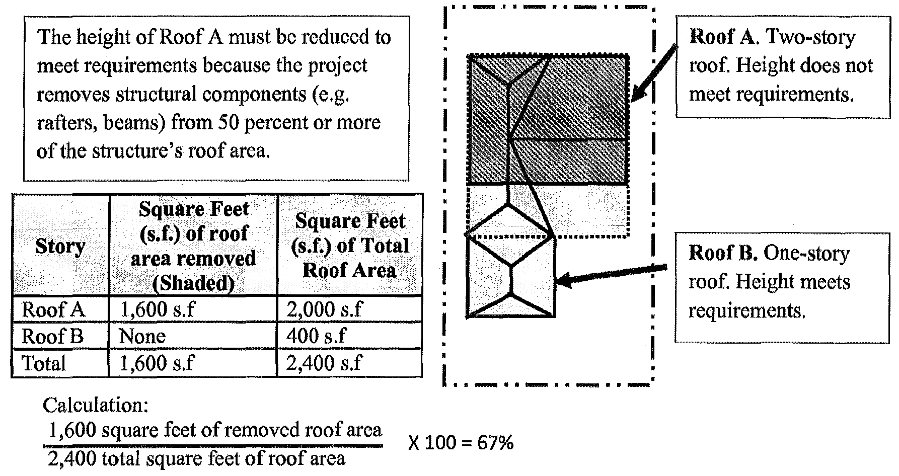 Calculation. Roof improvements are regulated based on the percentage of roof area that is removed or altered. The percentage of improvements is calculated by dividing the square footage of roof area that is removed or altered by the total roof area of a structure. This fraction is multiplied by 100. See Figure 17.72.050 C. for explanation.