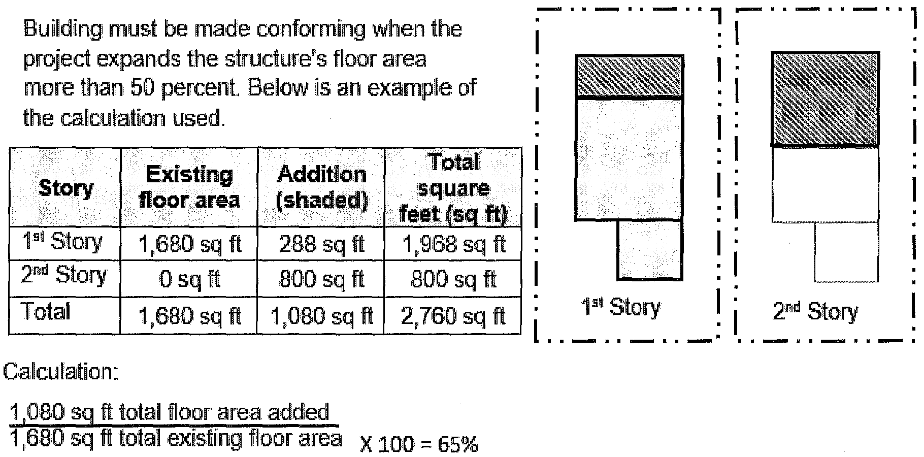 Calculation. Additions are regulated by percentages. The percentage of an addition ("or percent added") is calculated by dividing the square footage of an addition's floor area by the square footage of a building's existing floor area. This fraction is then multiplied by 100. See Figure 17.72.050(D) for explanation.