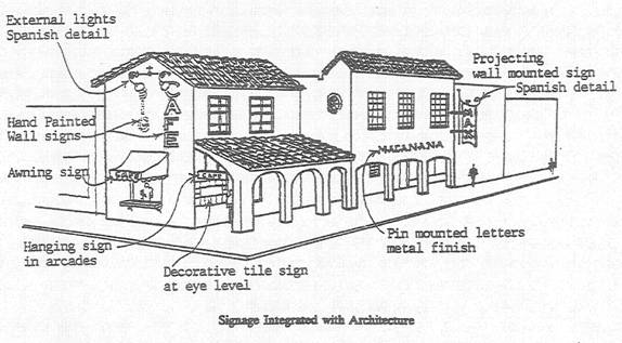 Design of signs within an Architectural Overlay District. .....The Architectural Overlay District sign standards are intended to maintain or enhance the character of the area. Public and private buildings have been constructed and maintained in the traditional Spanish Colonial Revival style of architecture. The district emphasizes a pedestrian orientation giving the area a distinct identity. The design, scale, color and materials of signs should be compatible with both the Spanish Colonial Revival style of architecture and the unique character of the district in which the sign is to be located. Therefore, signs within the Architectural Overlay District shall comply with the following additional standards: