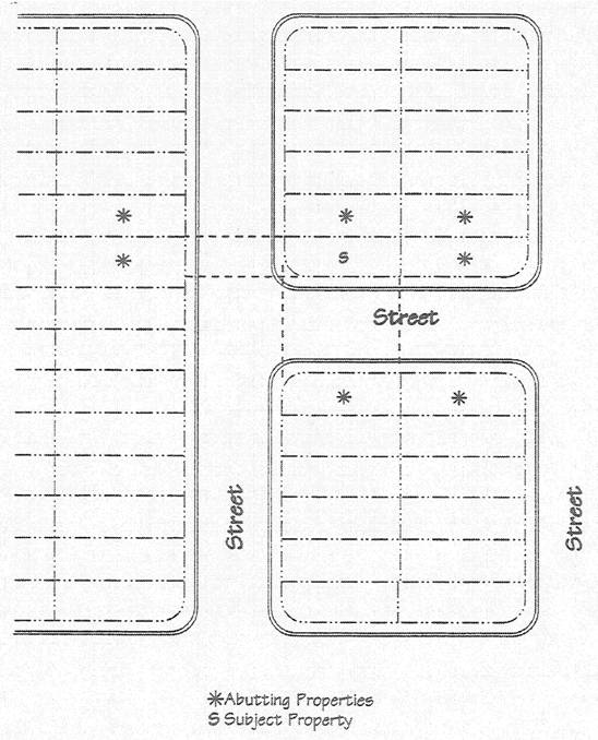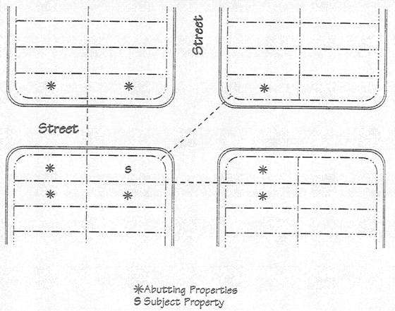 "Abutting" means having a common border with, or being separated from such a common border by a right-of-way, alley or easement. Properties separated by a street, alley, intersection, or other public right-of-way (other than an elevated interstate freeway), shall be considered abutting when their property lines would touch in any way if drawn to the center line of such street, alleyway, intersection, or other public right-of-way.