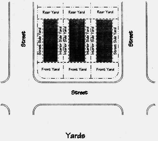 "Interior side yard" means an area extending from the required front yard to the required rear yard and from the interior side lot line to a structural setback line parallel to the side lot line. Where there is no required front and/or rear yard, the interior side yard shall be measured from the required front lot line and/or rear lot line, respectively.