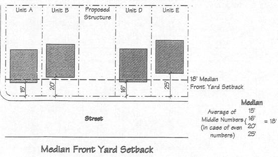 The median front yard setback—the median of the measurements taken from the front property line to the nearest point of the primary building (the "point of setback") on all improved lots within the block; or