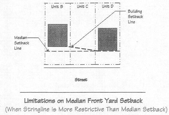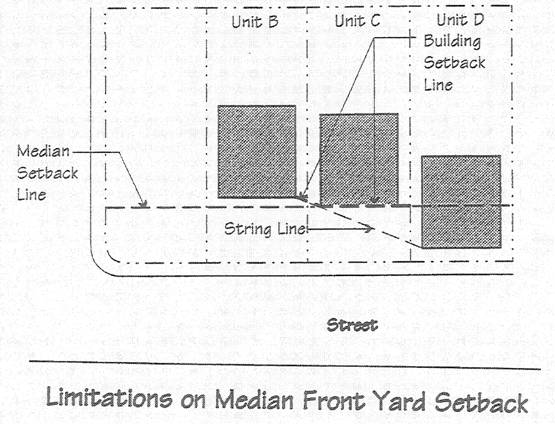 When the String Line Intersects and/or is Less Restrictive than the Median. Any portion of the string line that is less restrictive than the median shall not be used to allow a structure to encroach more than the median front yard setback established for the block.