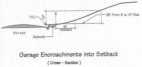 Encroachment. If the existing natural grade on the lot has a rise or fall in excess of 10 feet, as measured from the elevation at the established top of curb, attached garages may use the following setback and may be granted an exception to the required spacing between retaining walls in accordance with Section 17.24.180(D)2(b), Retaining Walls.