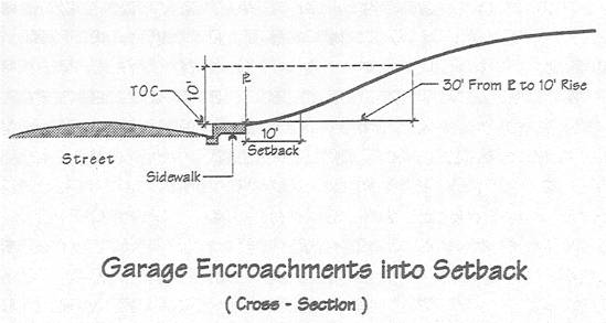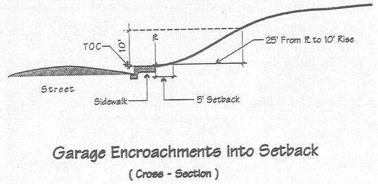 Purpose and Intent. Some residential lots within the City have a steep topography. On these lots, the requirement of the standard front yard setback for a garage could result in significant grading and/or fill. The purpose of allowing garages to encroach into the front yard setback on these lots is to reduce the need for mass grading or fill and allow structures to follow the natural topography of the site, either stepping up or down with the lot.
