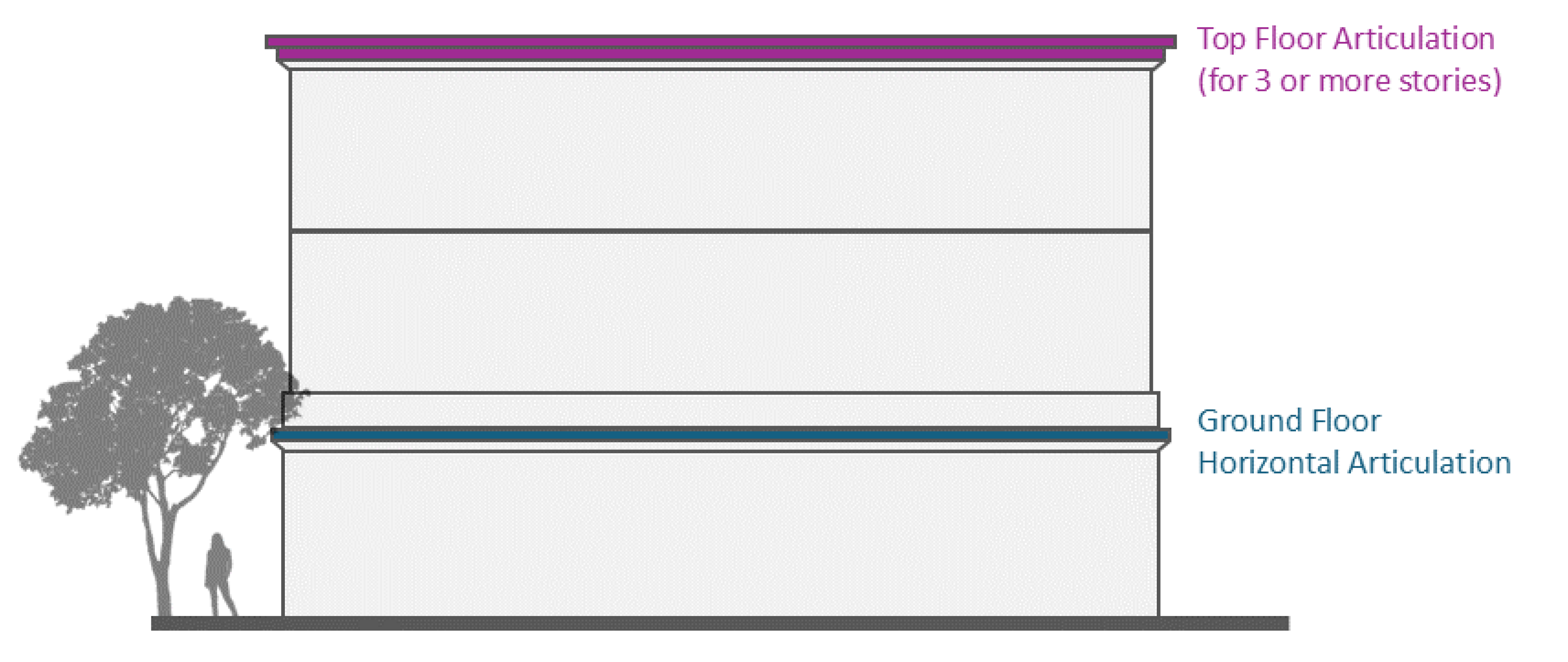 Building height articulation. In order to maintain a human scale for multi-story buildings, the height of façades shall be broken into smaller increments as follows:
