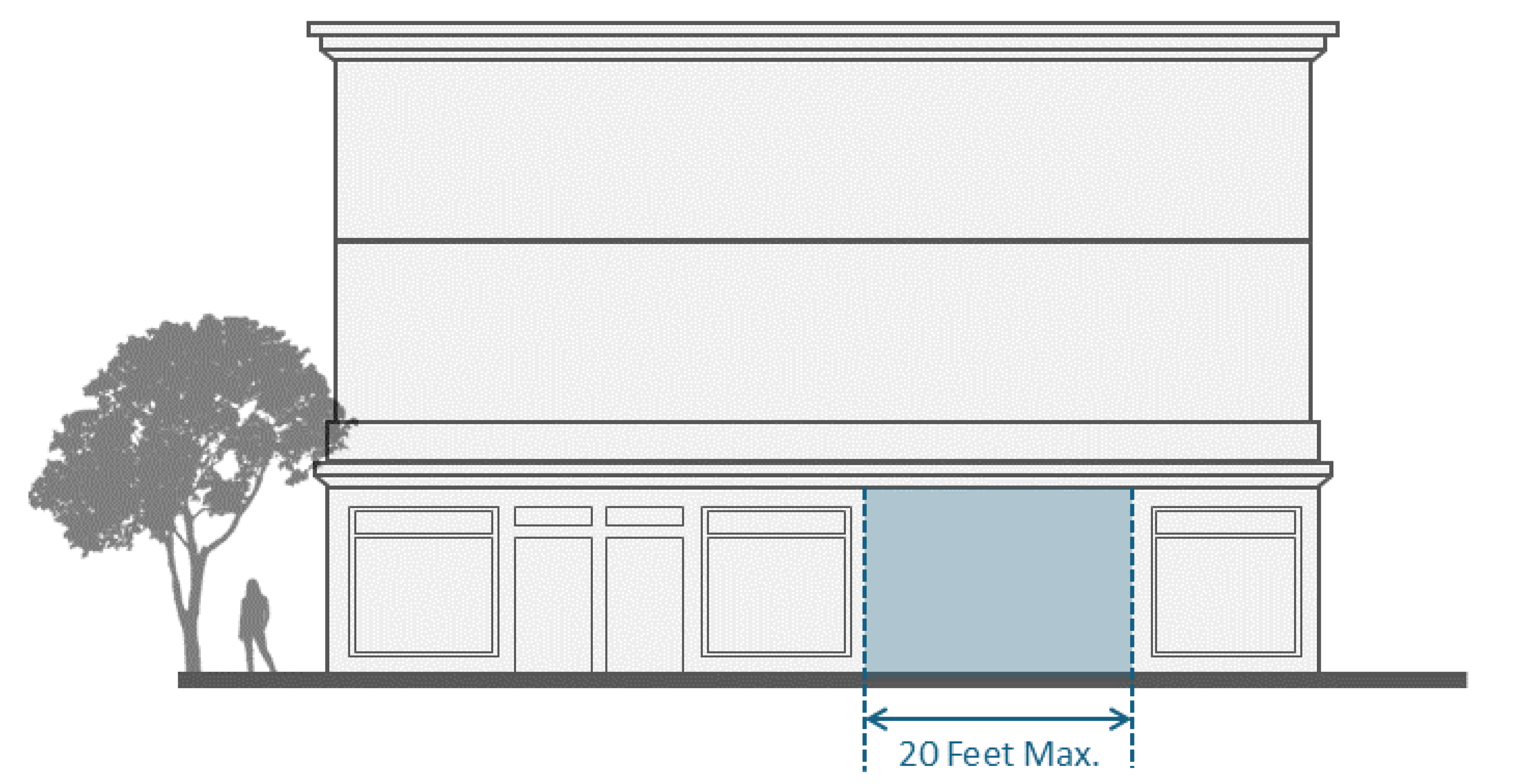 Blank building facades shall be prohibited. Building facades without the use of windows or doors shall not span a continuous horizontal length greater than 20 feet across any story.