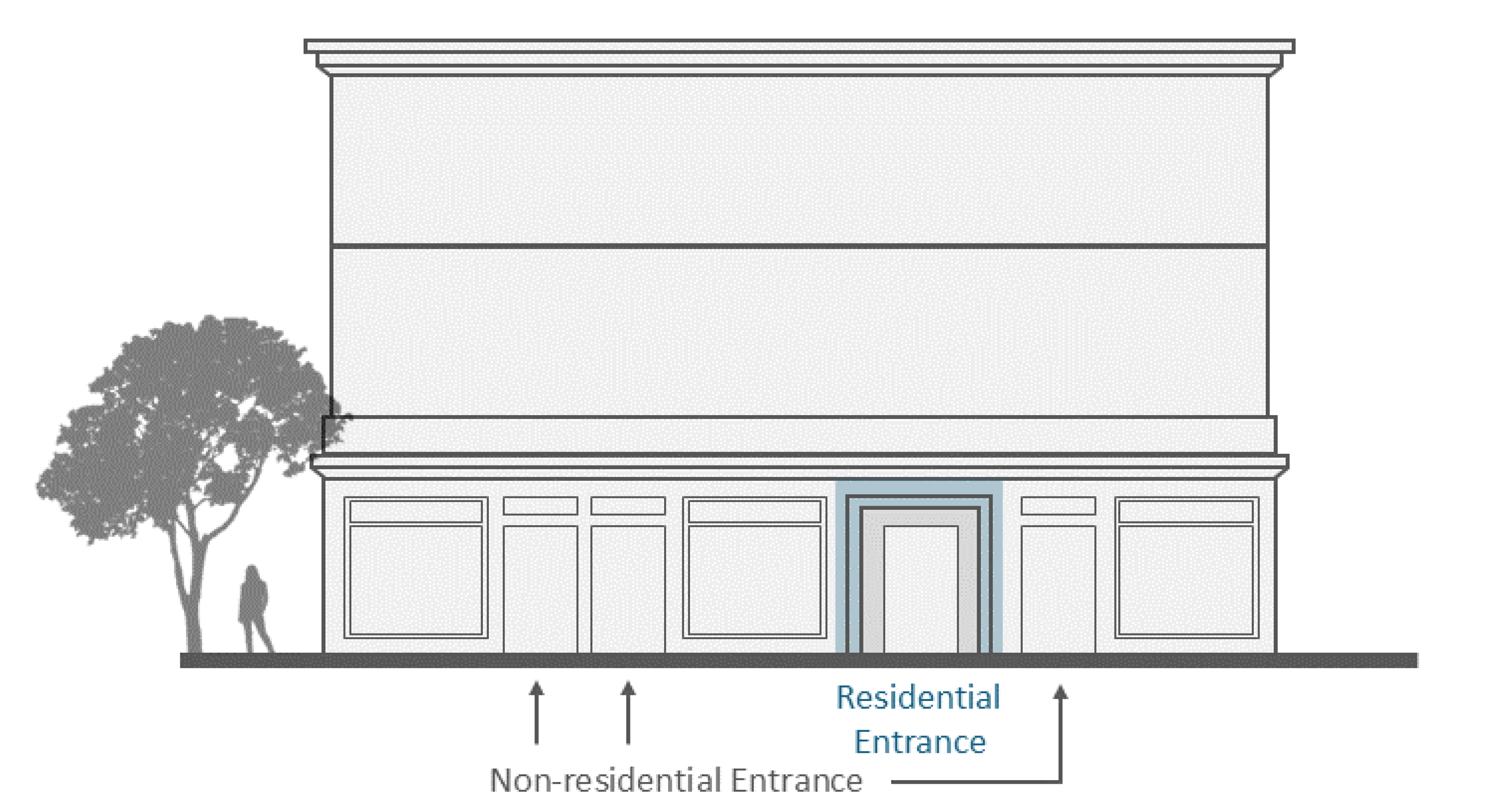 When non-residential and residential uses are located in the same building, separate exterior pedestrian entrances, elevators and lobbies shall be provided for each use. The entrances for non-residential uses shall be designed to be visually distinct from the entrances for residential uses.
