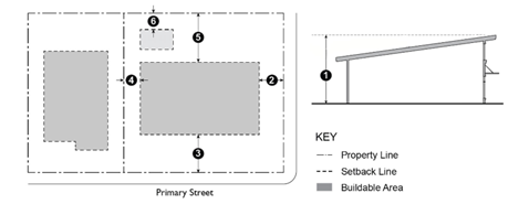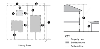 Table 9-200.030-1 prescribes the development standards for the Residential zones. The numbers in the illustration refer to corresponding regulations in the "#" column.