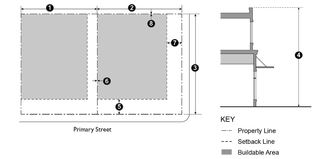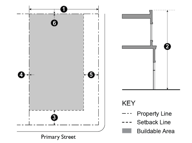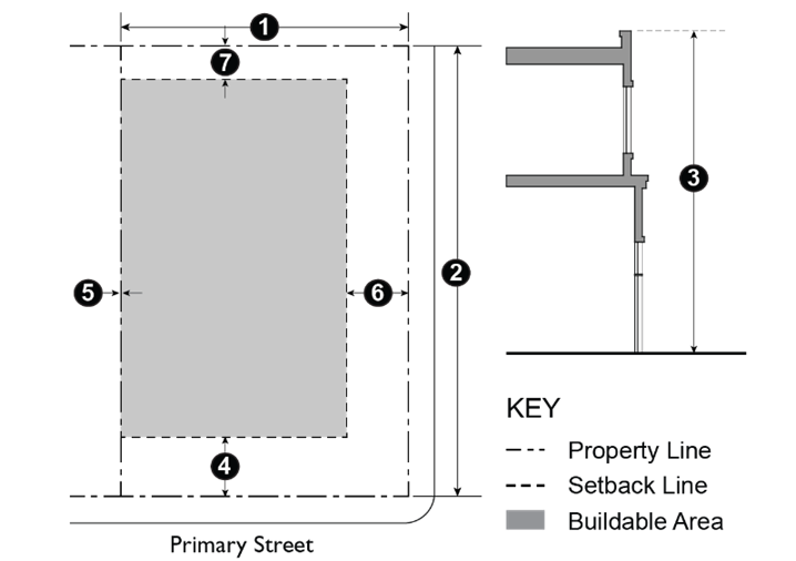 Table 9-204.030 prescribes the development standards for the P-F, M-X, and AP-X Zones. The numbers in each illustration refer to corresponding regulations in the "#" column in the associated table.