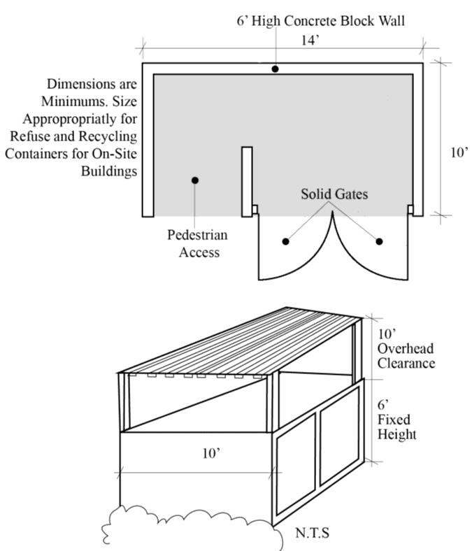 Enclosures shall be constructed of solid masonry material with decorative exterior surface finish compatible to the main building(s). Split-face concrete block finish is recommended. Brick or tile veneer exterior finish should be avoided.