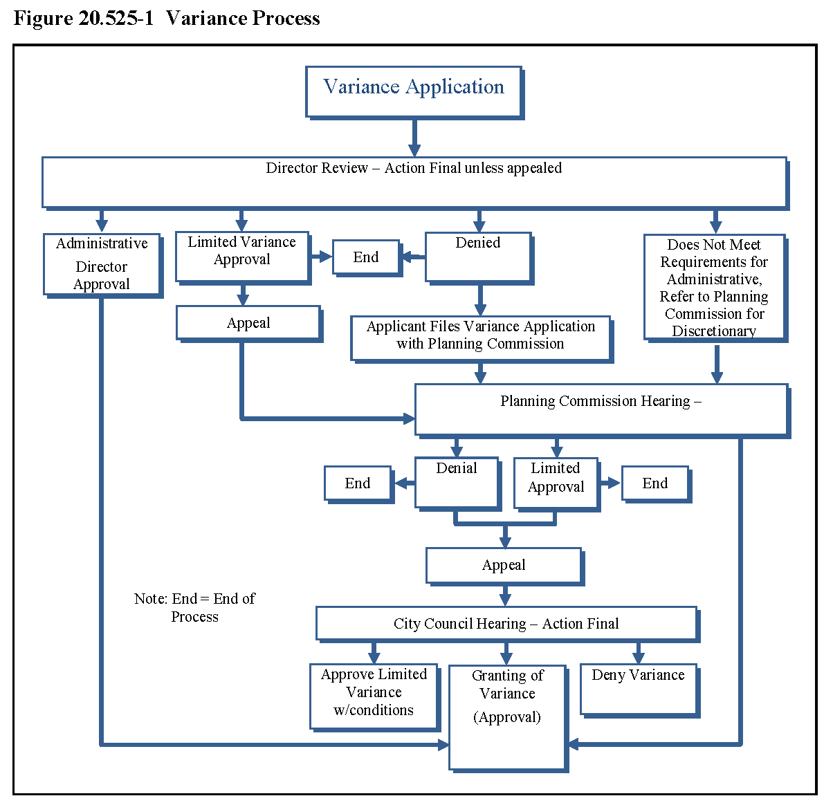 Processing. The administrative and discretionary processes for Variance applications is generally illustrated in Figure 20.525-1, "Variance Process." When an application is deemed complete, the Director shall give public notice and a hearing or hearings shall be held as provided in Chapter 20.505 (Noticing and Public Hearings).