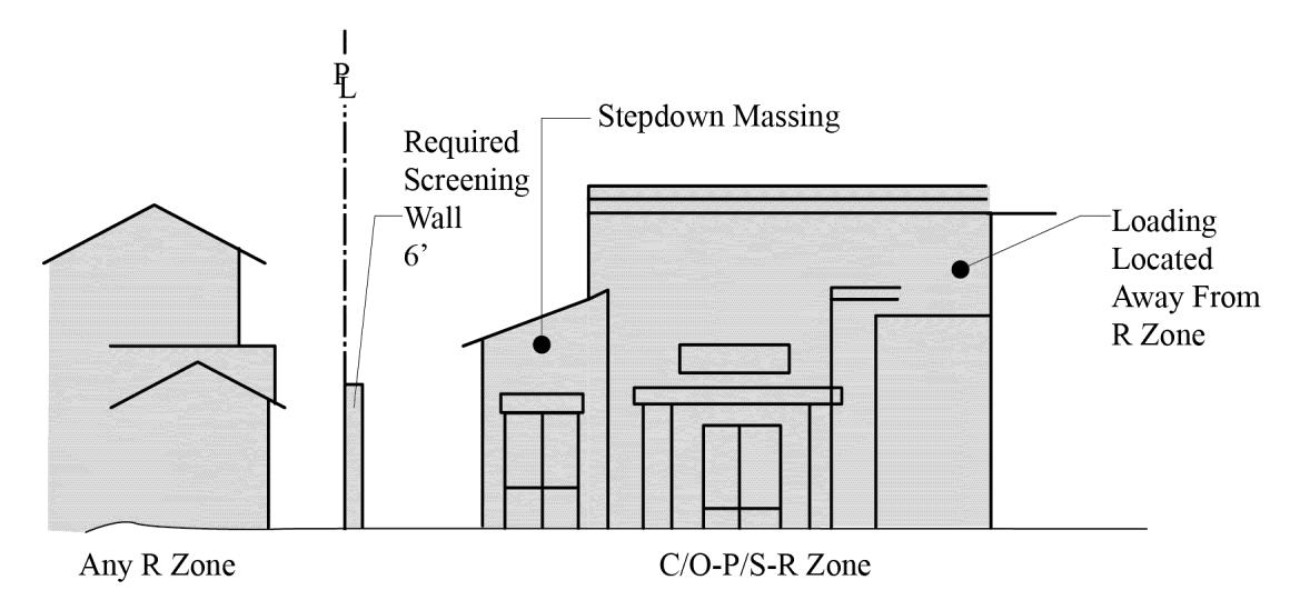 All buildings within the C, NC, O-P, and S-R Zones shall provide step-down massing for building height transitions adjacent to Residential Zones; see Figure 20.220-1.
