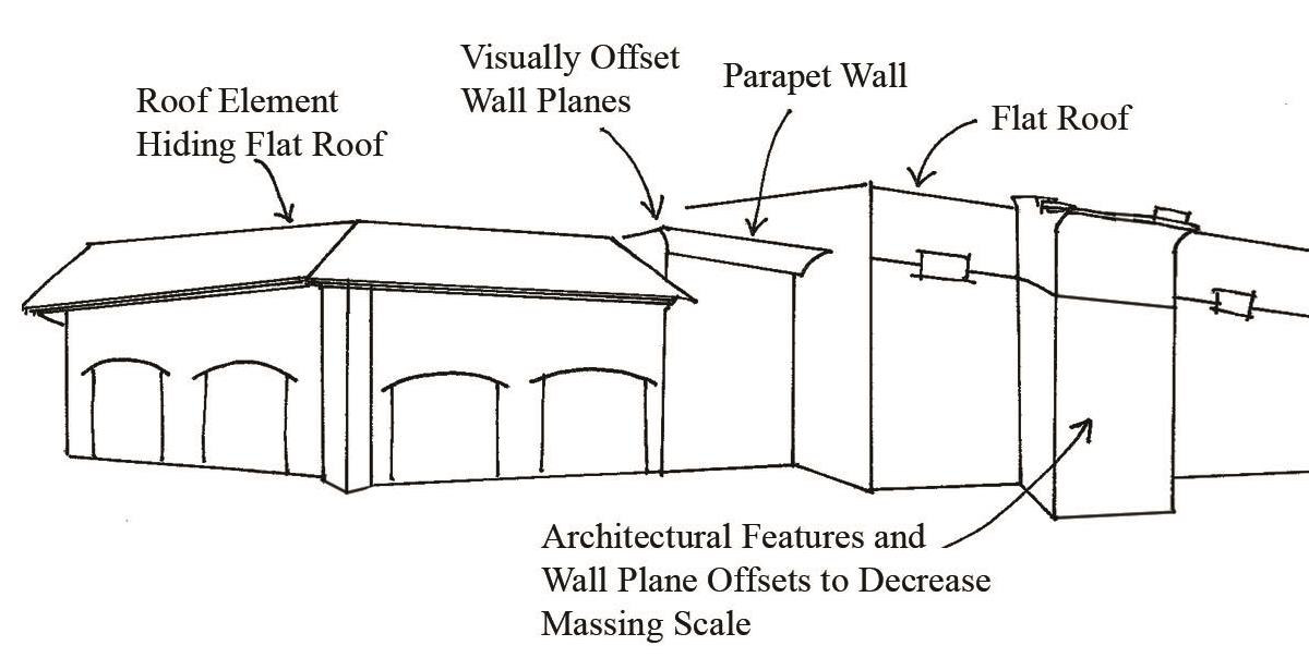 Pedestrian Scaled Elements. To generate a pedestrian-scaled commercial setting, all buildings shall reduce building massing through changes in building height and roof form, and the introduction of pedestrian-scaled elements.
