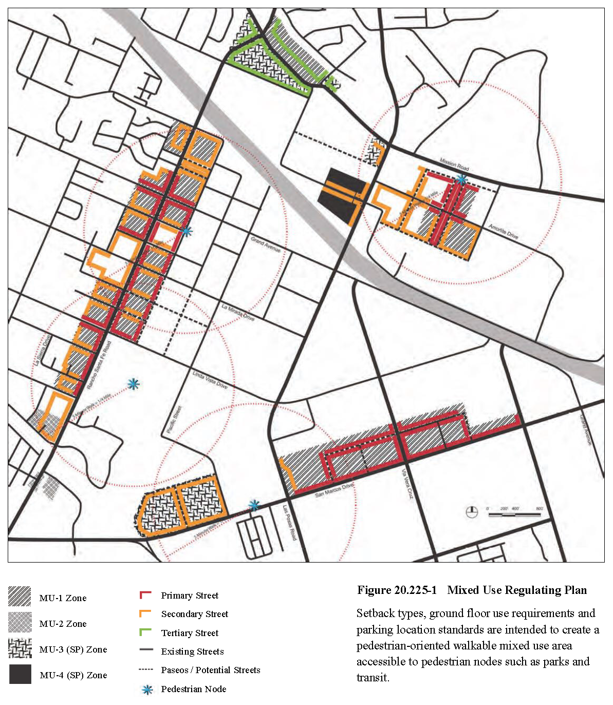 Regulating Plan. Figure 20.225-1 is the Regulating Plan for the Mixed Use Zones. The Regulating Plan further modifies the zoning designations of the Zoning Map by adding form- base standards such as setback types, and place-oriented regulations to each Zone. The development standard tables of each Mixed Use Zone (Tables 20.225-1, 20.225-2, 20.225-3, and 20.225-4) reference features and locations represented on the Regulating Plan.