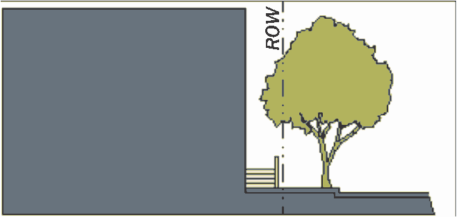 Stoop. The main façade of the building is near the build-to line and the elevated stoop addresses the sidewalk. The stoop should be elevated a minimum of twenty-four (24) inches above the sidewalk to ensure privacy within the building. The stairs from the stoop may lead directly to the sidewalk or may be side-loaded. The stoop shall have a minimum dimension of five feet in width and depth. This frontage type is appropriate for residential and live/work uses with minimal setbacks.