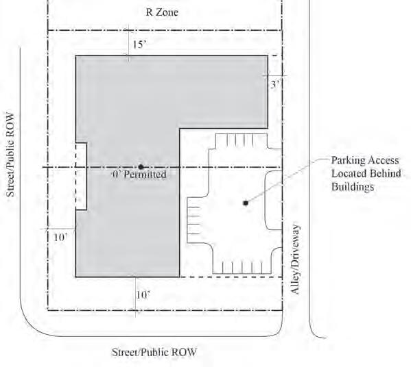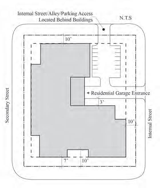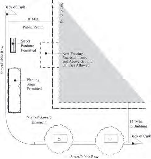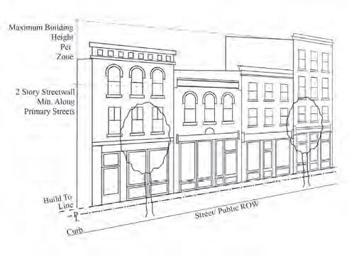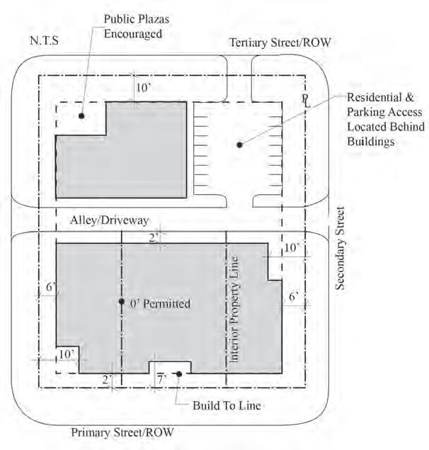 floor uses are required along primary streets. Setbacks close to the street create