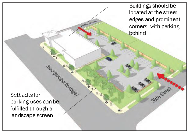 Regulating building form, frontage types, and parking locations focus development
