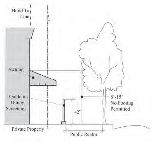 Outdoor Dining. Outdoor dining areas are not required to meet the building placement standards of the Zone. Site and building design are encouraged to incorporate areas for outdoor dining where a minimum of six (6) feet clear is provided between the dining area and the ROW back of curb. See Section 20.400.150 (Outdoor Dining) for additional standards.