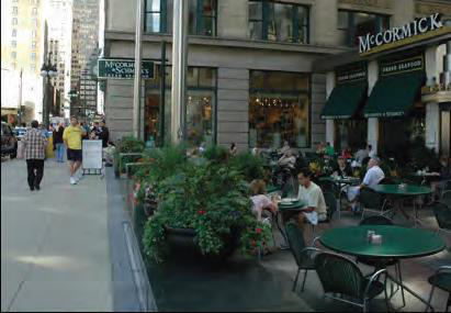 entrances, and provide areas for outdoor dining, events, kiosks and community spaces.