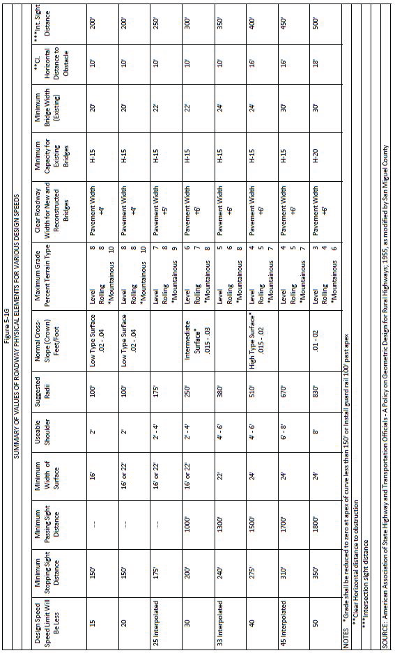 Projection of future development and densities, estimates of future traffic volumes, appropriate classifications, design speeds, and terrain category must be determined prior to design of a new road (see also Section 5-501 G). Road classification and terrain category together shall determine the required geometric cross-section and maximum sustained grades, while design speed shall determine minimum or maximum standards for elements of alignment such as stopping and passing sight distances, radii of curvature, tangent lengths, and super elevation transition lengths.