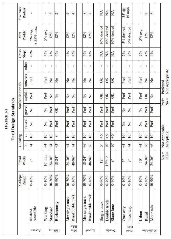 Trails in San Miguel County shall be designed specifically for hiking, bicycling, mountain bicycling, horseback riding, nordic skiing or any combination thereof. As a result, the Board of Commissioners may require any specific standards (including less restrictive standards) for a particular proposed trail, or section thereof, based on the design standards set forth in Figure 5-2 and the "Trail" definitions in Article 6.