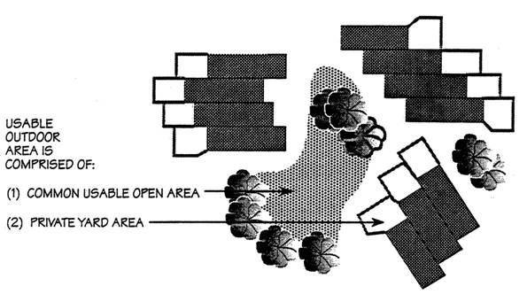 "Usable outdoor area" means an area open to the sky with a slope less than ten percent (10%). The usable outdoor area shall be a well-defined coherent space that is an integral component of the project design. Usable outdoor area includes private yard areas and common areas suitable for passive and active recreation use. Such areas may be located on the ground, roof, balcony, patio or terrace; and excludes minor decorative landscaping, driveway areas, parking facilities, and utility or service area. Common usable outdoor area shall have a minimum dimension of twelve feet (12′).