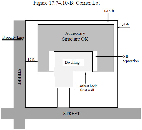Detached Accessory Structure Setbacks. Table 17.74.10 below and Figures 17.74.10.A. and B. specify setbacks for detached accessory structures. If not specified below, these structures are subject to the standards identified in the respective zoning district where the structure is to be located. For purposes of these regulations, solariums, greenhouses, garages, or other enclosed areas which are attached to the residential structure shall not be considered accessory but shall be considered part of the primary building. Rigid frame fabric structures are considered accessory structures subject to these standards.