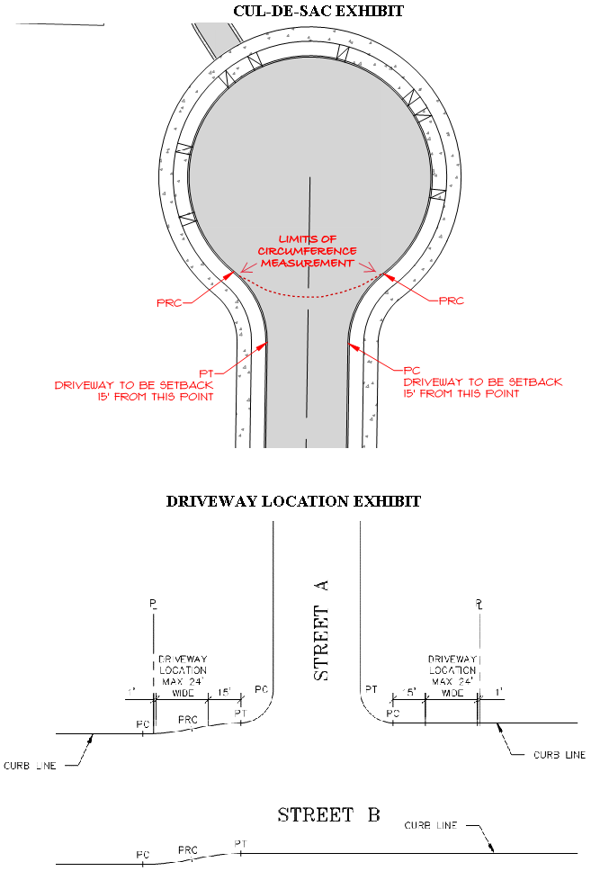 The sum of the width of all driveway approaches within the bulb of a cul-de-sac as measured in section B., above shall not exceed 50 percent of the circumference of the cul-de-sac bulb. The cul-de-sac bulb circumference shall be measured at the curb line and shall not include the width of the stem street. The nearest edge of driveway approaches in cul-de-sacs shall not be located within 15 feet of the point of curvature, point of tangency or point of reverse curvature of the curb return on the stem street.