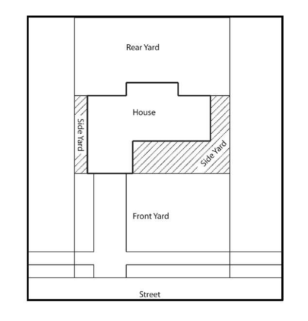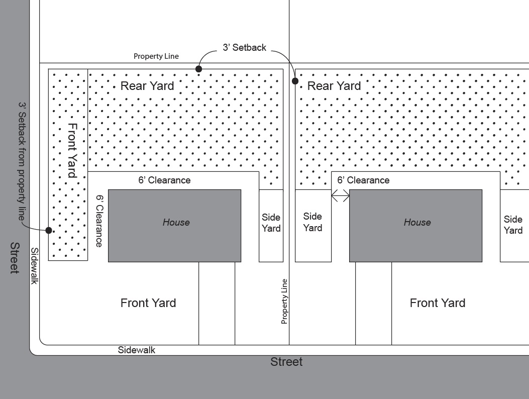 *There shall be a minimum three-foot-wide unobstructed access to the rear yard for emergency purposes. Said access may be gated, and may be located on either side yard of the home.