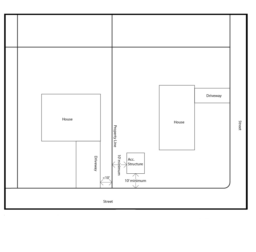 Corner Lots. An accessory structure may be located between the main dwelling unit and the front property line (see Figure 1), adjacent to a street, if the structure complies with the maximum height and size requirements listed below. These structures must be at least six-feet from the main dwelling and two-feet from the property line. No structures are allowed within the sight visibility triangle. These structures will not be allowed to have access to the public right-of-way closest to the structure, unless the Transportation Engineer reviews and approves the location based upon safety of pedestrians and vehicular access.