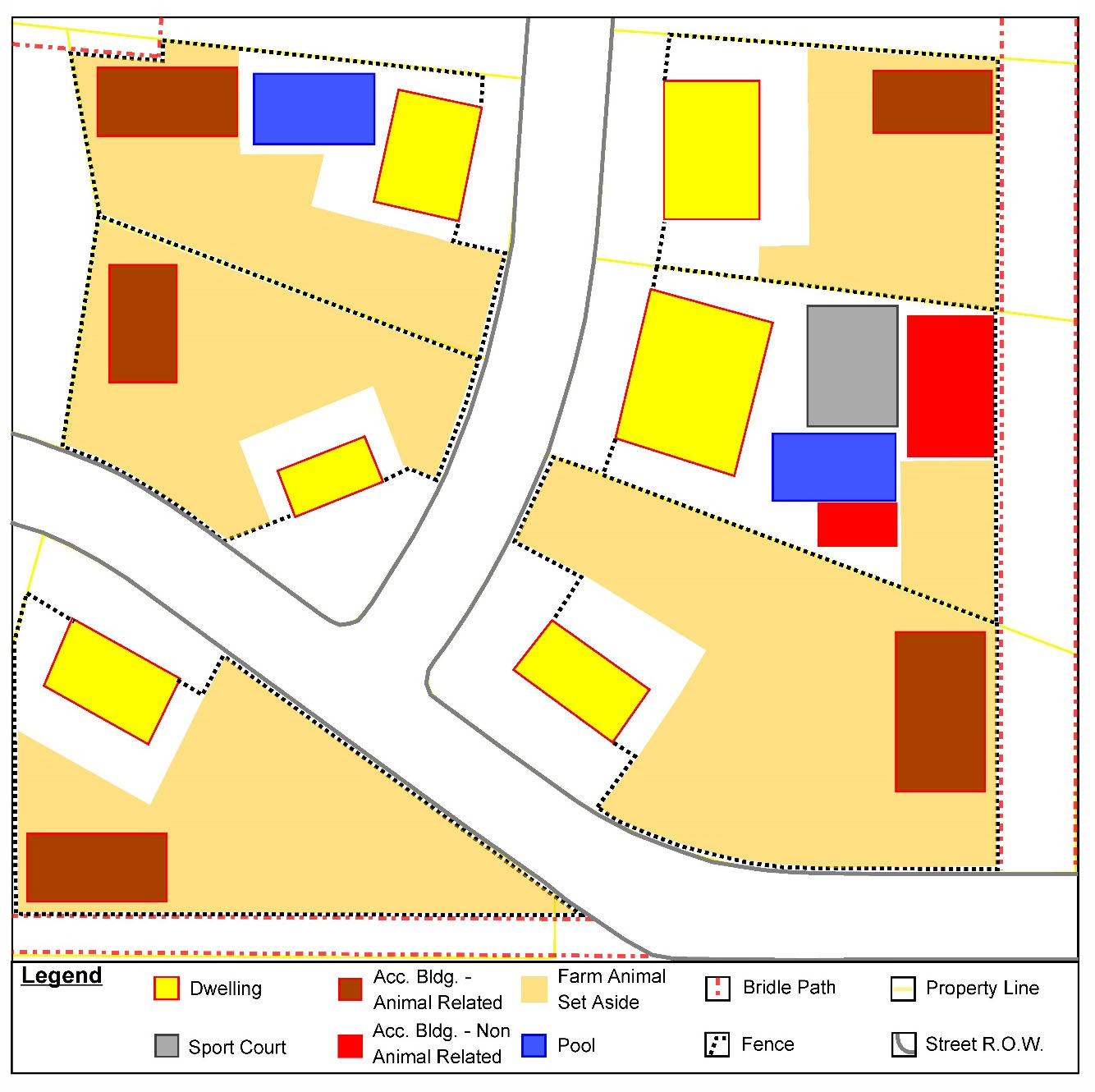 Farm Animal Area Set Aside. A minimum of 5,000 square feet of usable square footage must be designated and maintained on each lot for the housing and containment of farm animals (the "farm animal area set aside"), regardless of whether or not farm animals are maintained on the lot. This area may consist of stables, hay barns, turnouts, etc., or any other structure that its primary use is related to the keeping of farm animals. Areas that may not be used to satisfy the farm animal area set aside include front yard (area between the front plane of the home and the street); side yard (15 feet from primary dwelling); rear yard (30 feet from primary dwelling); and areas dedicated for other uses (bridle paths, pools, non-animal related accessory structures, etc.). Side and rear yard areas that are 25 feet or greater in width may be used as the farm animal area set aside and must be contiguous areas on the lot. The farm animal area set aside may be used for other purposes when not needed for farm animal housing and confinement but must be easily returnable to an area for housing and containment of farm animals. Structures and other improvements (such as sport courts, patios, parking areas, paved driveways, etc.) that would have to be removed or substantially modified in order to use the area for farm animal housing and containment are not allowed within the farm animal area set aside. The farm animal area set aside may not be used at any time for residential dwellings (see Figure 1).