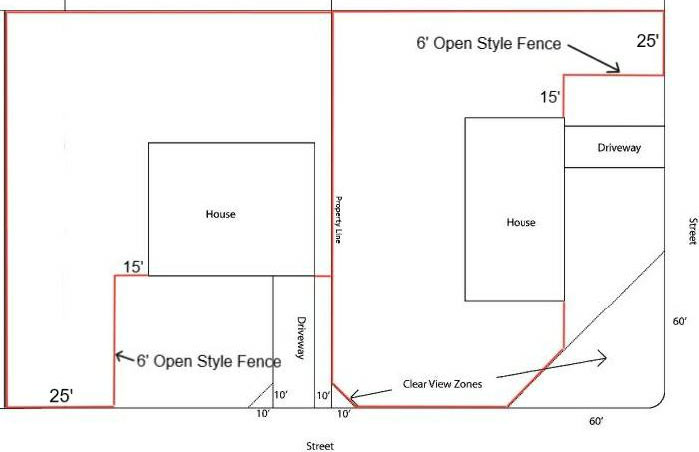 A six-foot open style fence for the keeping of animals is allowed within a portion of the front yard area. The fence may not be in front of the home (that area between the front of the home and the street and at least 15 feet on either side of the home) and must be located outside of any required sight visibility triangle areas (see Figure 2).