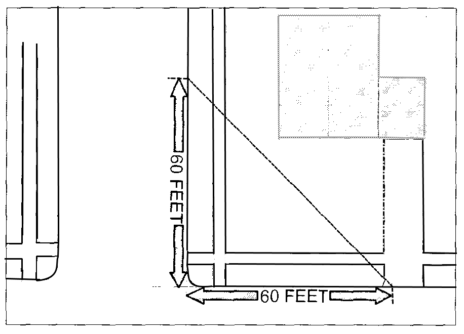 In all districts or uses for which a front yard is required, no opaque obstruction to view in excess of three feet high (above top back of curb) shall be placed on any corner lot within a triangular area formed by the intersection of straight lines extended from the back of the curb (or future curb) and a line connecting them at points 60 feet from the intersection of the curb line, except a reasonable number of trees pruned to permit unobstructed views to automobile drivers.