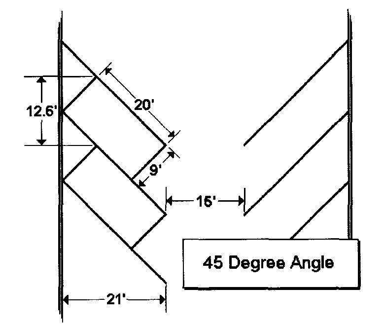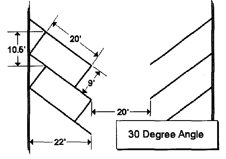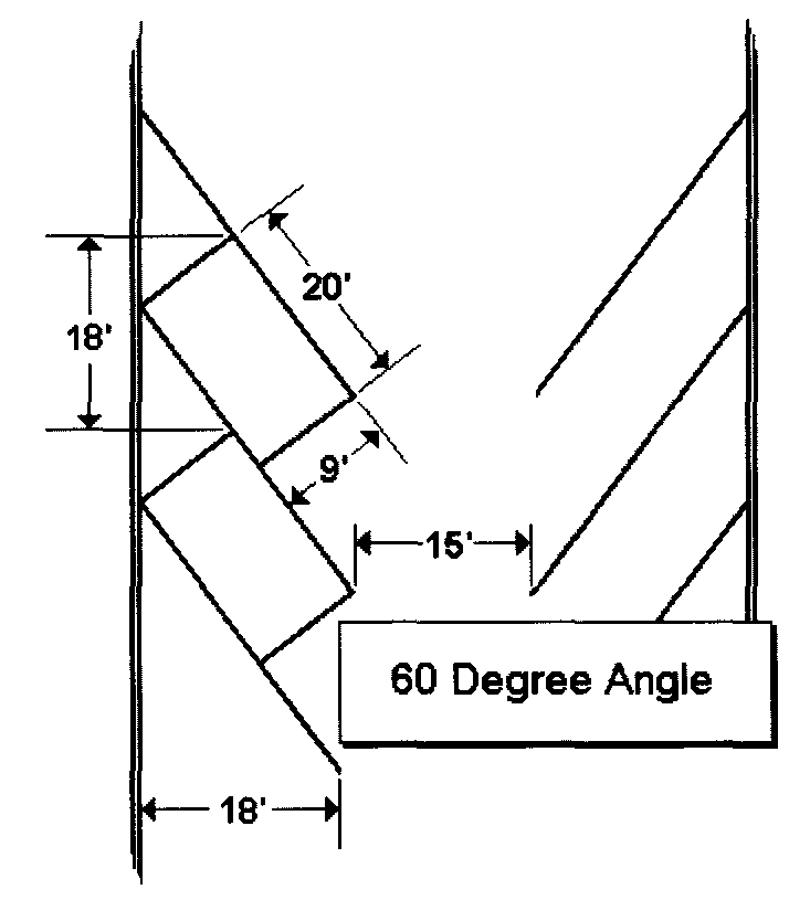Ninety-degree stalls within parking structures shall be a minimum of nine feet wide by 18 feet long. Drive aisle dimensions and all other angled parking shall be designed according to the specifications listed within the chapter.